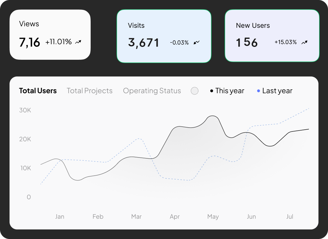 Convertimos grandes volúmenes de información en data visualization clara, contextualizada y orientada a resultados. Cada elemento visual está optimizado para comunicar insights específicos, reducir el tiempo de análisis y potenciar la comprensión de KPIs críticos.